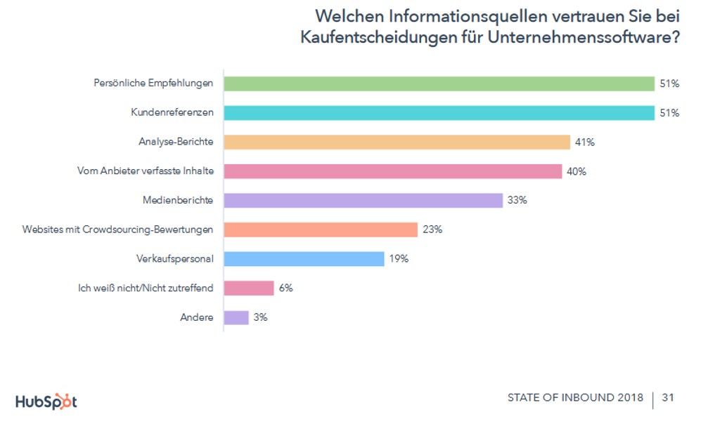 Let's take a look at the Hubspot State of Inbound Study from 2018. The study is based on responses from 6,200 respondents in German-speaking countries. According to HubSpot, decision-makers used to gather information primarily at customer events and trade shows, as well as through personal recommendations and media articles, before making a purchase decision. Today, customer references and personal recommendations are among the top sources of information at the C-level.