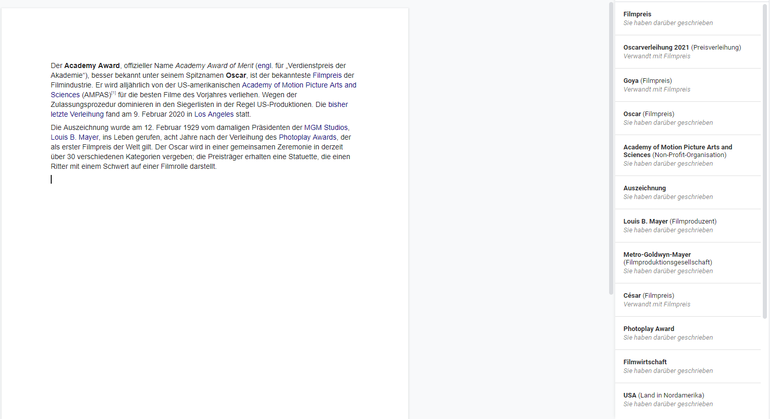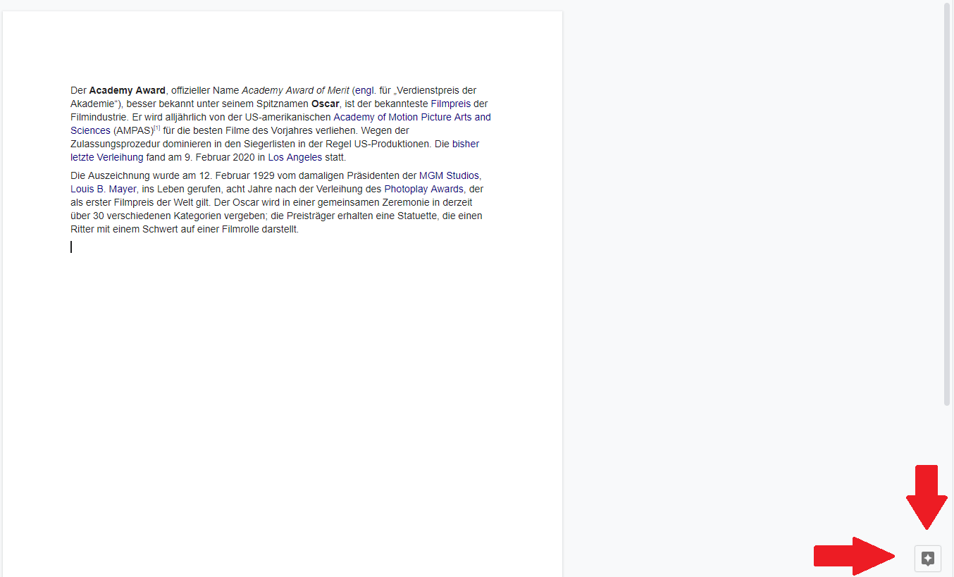 Although most people probably know how to create and edit Google Docs, this feature is often overlooked. In Google Docs, simply copy the text into a blank document. As an example, I'll use the introductory text from the Wikipedia article on the Oscar (Academy Award). You can see the "hidden feature" for displaying the entities in the screenshot where the red arrows point.