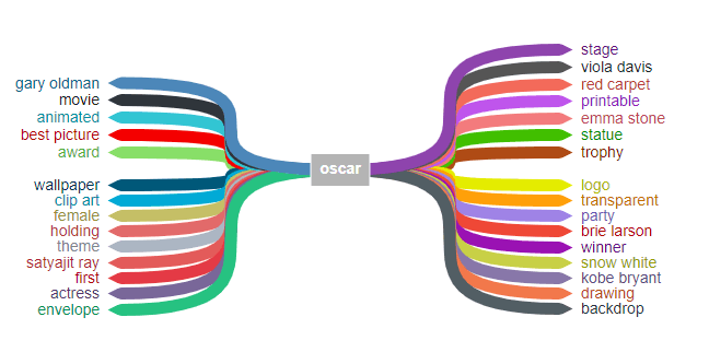 In relation to the example of the Oscars, these would include: movie, stage, winner, trophy, award, actress, red carpet, Gary Oldman, and Emma Stone (source: Entity Explorer).