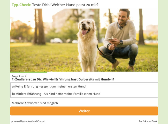 Quizze sind eine unterhaltsame und leistungsstarke Strategie im Content-Marketing. Durch Infotainment-Quizze kannst du deine Zielgruppe informieren und unterhalten und dabei Leads generieren. Studien haben gezeigt, dass Quizze auch die E-Commerce-Erlöse steigern können. Füge am Ende des Quizzes Produktempfehlungen hinzu, um deine Zielgruppe direkt zum Kauf oder zur Buchung zu führen. Integriere Quizze in deine Content-Marketing-Strategie, um dein Unternehmen zu bewerben.